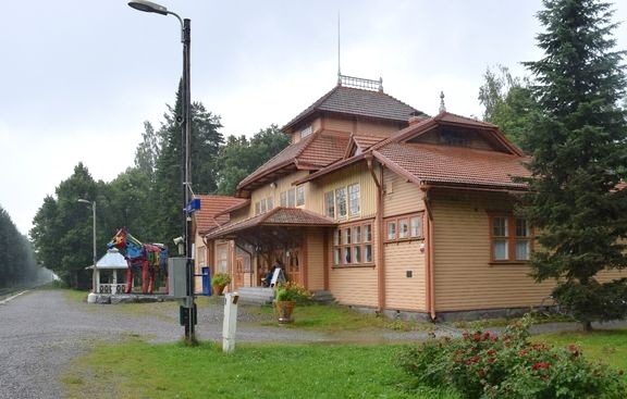 Luston asemarakennus ja asemapuistoa, lehmuskuja vasemmalla radan vieressä. Kuva: Katri Nousiainen, Riihisaari – Savonlinnan museo 2023